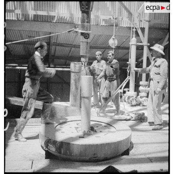 Des ouvriers s'affairent autour du puits de pétrole, ils manipulent une partie du trépan.