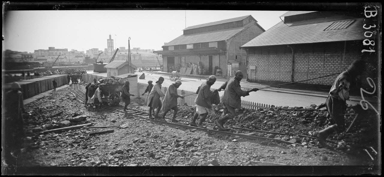 Dans le port de Casablanca, indigènes déchargeant du charbon à l’aide de wagonnets. [légende d’origine]