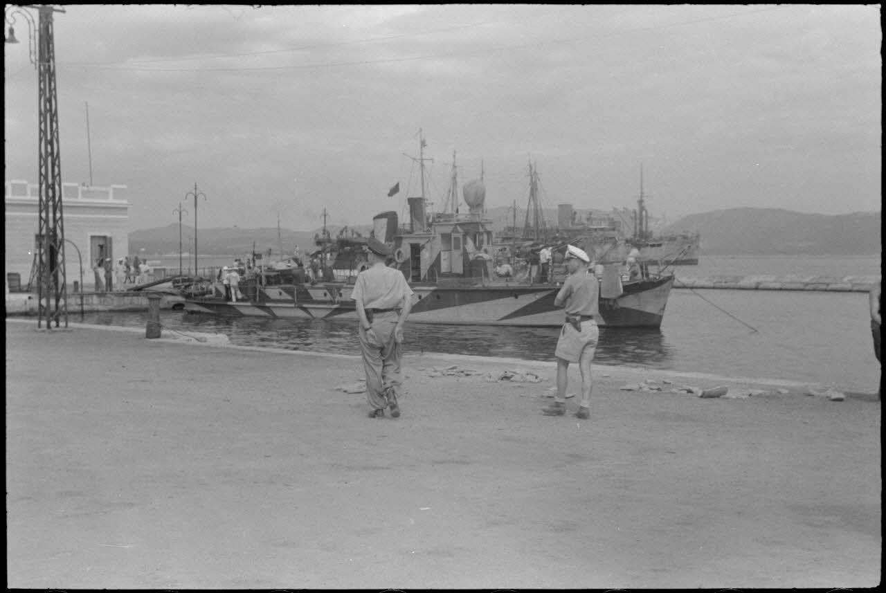 Des navires allemands de type Raumboot quittent le port de Corfou.
