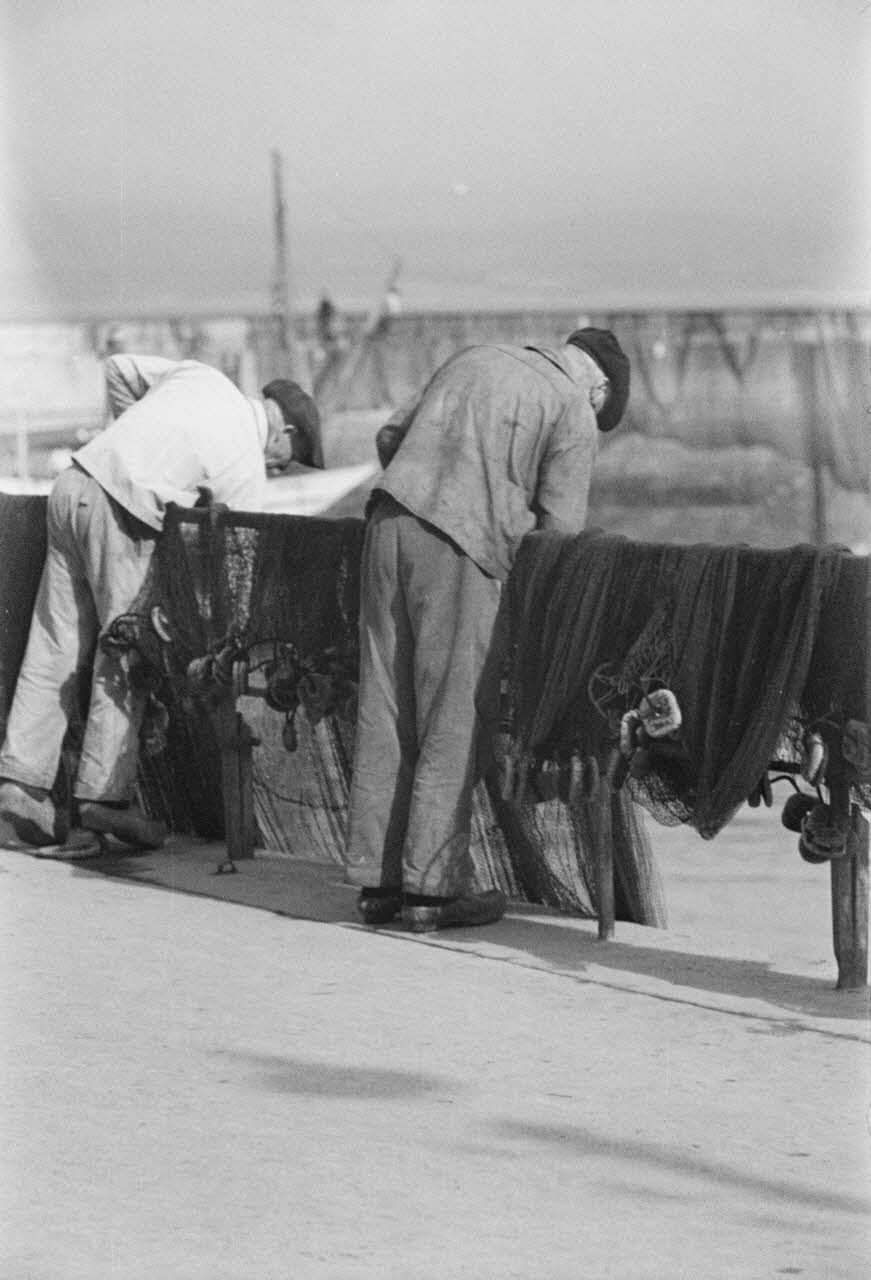 Deux hommes dont un vieillard observent le retour de la pêche dans le port de Douarnenez.