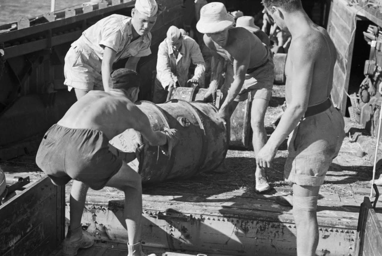 Dans le port de Marsa Matruh, le déchargement du ravitaillement de l'Axe par des prisonniers anglais et néo-zélandais.