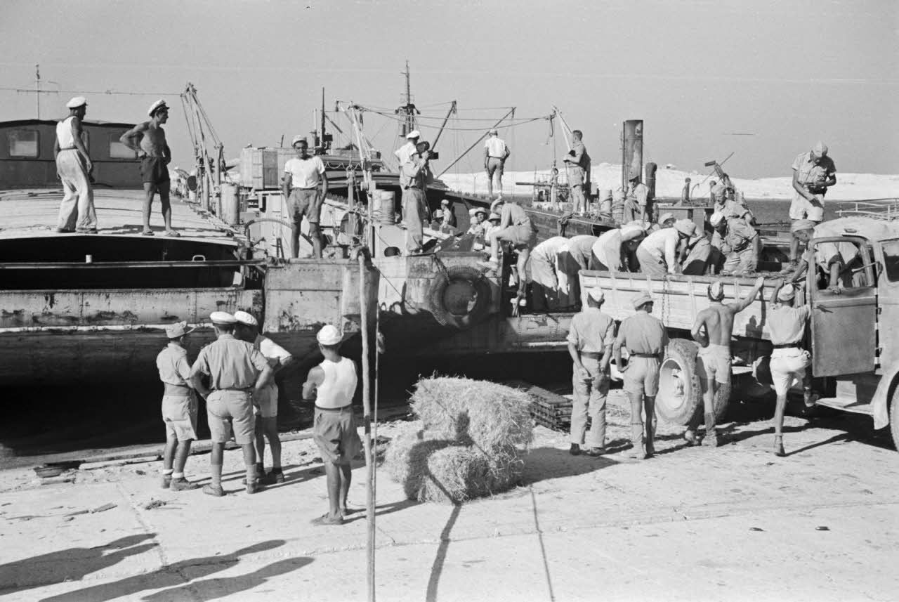 Dans le port de Marsa Matruh, le déchargement du ravitaillement de l'Axe par des prisonniers anglais et néo-zélandais.