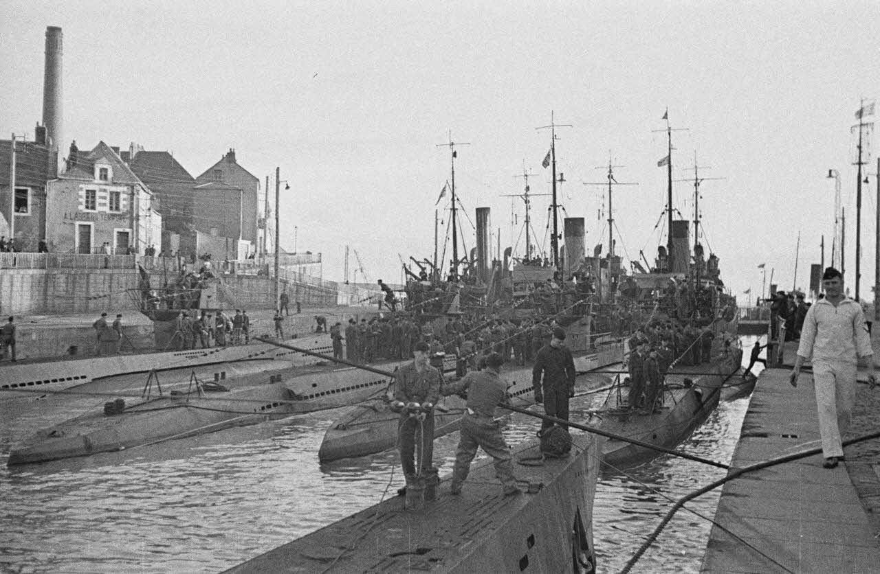 Dans le port de Saint-Nazaire, des dragueurs de mines protègent des sous-marins allemands peu avant leur appareillage.