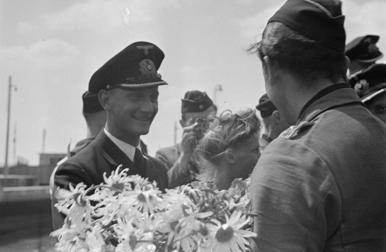 Dans le port de Saint-Nazaire, l'accueil réservé au commandant du sous-marin U-203, le Kapitänleutnant Rolf Mützelburg.