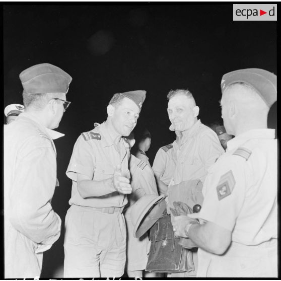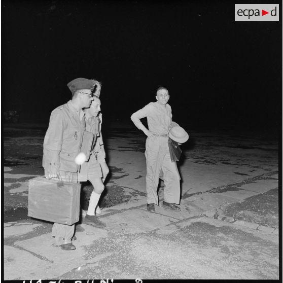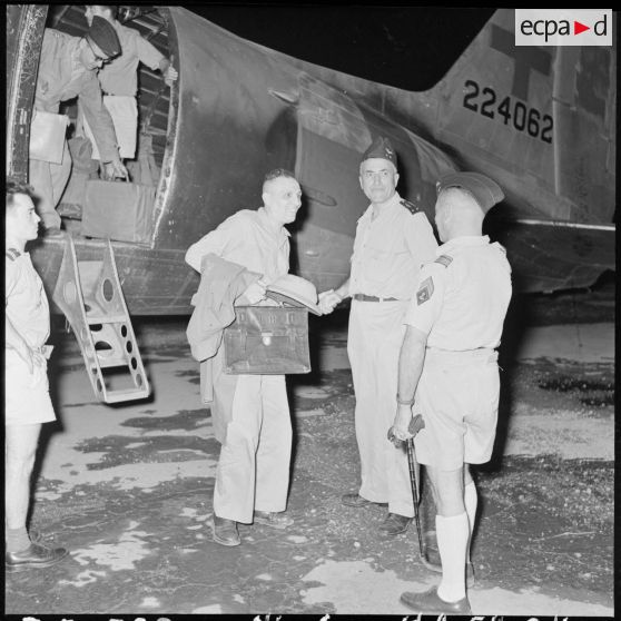 Le général Dechaux, commandant du GATac-Nord et le commandant de Maison Rouge, chef du cabinet du général Cogny, accueillent le professeur Huard à sa descente d'avion.