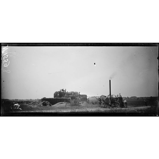 - À Saint-Martin-sur-le-Pré, des équipes militaires agricoles assurent le battage du blé à l'aide d'une batteuse à vapeur.