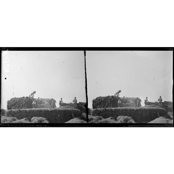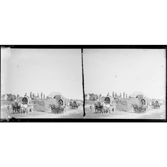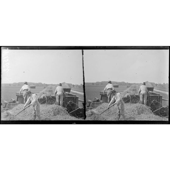 - À Bouy, des hommes préparent le ravitaillement en fourrage pour la cavalerie.