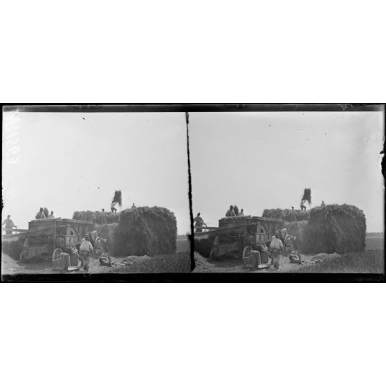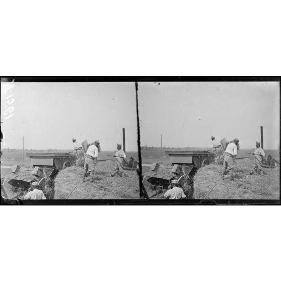 Saint-Martin-sur-le-Pré (Marne). Equipes militaires agricoles, le battage du blé (18-6-17).