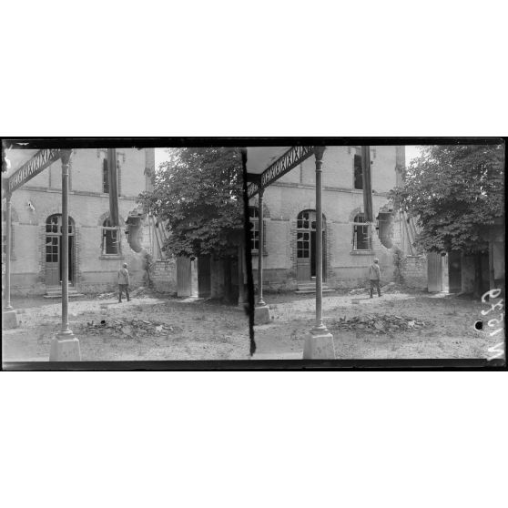 - À Mourmelon-le-Grand, l'école et le mur du cimetière sont endommagés. Des hommes du 300e régiment d'infanterie sortent à cheval du village.