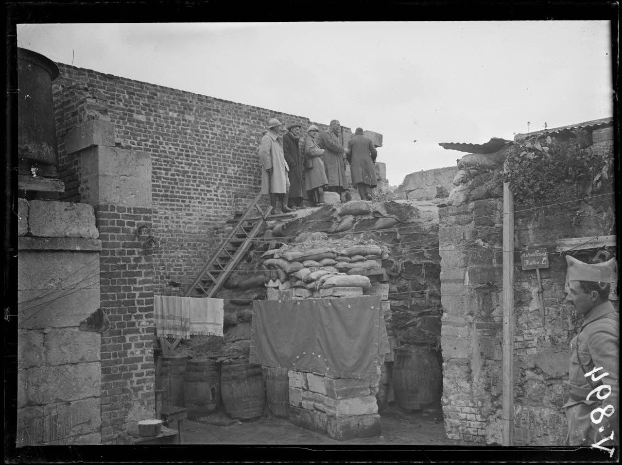 - Le capitaine Saynes, attaché naval des Etats-Unis à Paris, visite la cathédrale de Soissons (Aisne, le 06/06/1916) et observe les lignes ennemies de la passerelle établie sur l'Aisne (V 917). Le capitaine Saynes se rend près des premières lignes, situées à Villeneuve-Saint-Germain (Aisne, le 06/06/1916, V 919 à V 922) où il visite une casemate pour canon de 75 mm.
