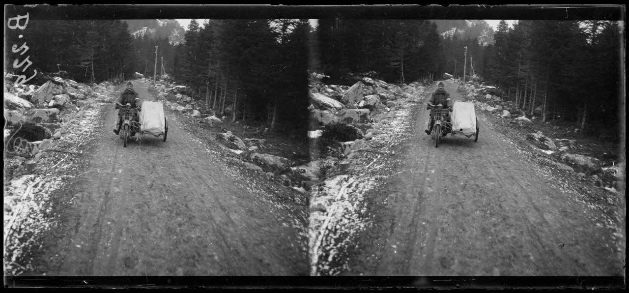 Dans les Vosges, side-car d’ambulance anglaise. [légende d’origine]