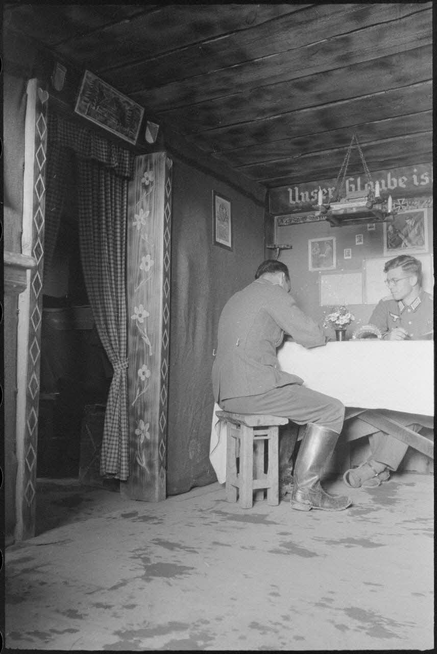 Un fantassin sculpte un bâton de marche (PK697 F772 L11 et L12). Des fantassins autour d'une table vont partager un verre d'une bouteille de Underberg (Semper idem) aux plantes aromatiques ( PK697 F772 L13 à L15). Aspects des lits réservés aux soldats, un poêle à bois les préserve du froid. Le sommier est rudimentaire et le plafond loge les fusils Mauser 98 k et les casques. Chaque recoin est utilisé pour ranger des objets, ici le plancher reçoit également des provisions aromatiques (PK697 F772 L23 à L24). Au mur, des étagères accueillent des livres et de la vaisselle. Plus loin, une pièce est réservée à un officier ( PK697 F772 L26 à L27). L'entrée de l'abri baptisé "Bunker der schweren Jungs" (abri des jeunes costauds) ( PK697 F772 L28). Un râtelier accueille l'équipement individuel des fantassins, composé de fusils Mauser 98k, de casques et de masques à gaz ( PK697 F772 L29). Au mur, une étagère accueille le courrier et de la lecture, ici le magazine "Die Woche" ( PK697 F772 L30). Un portrait d'Adolf Hitler et une horloge (coucou) se partagent le reste du mur ( PK697 F772 L31 et L32).