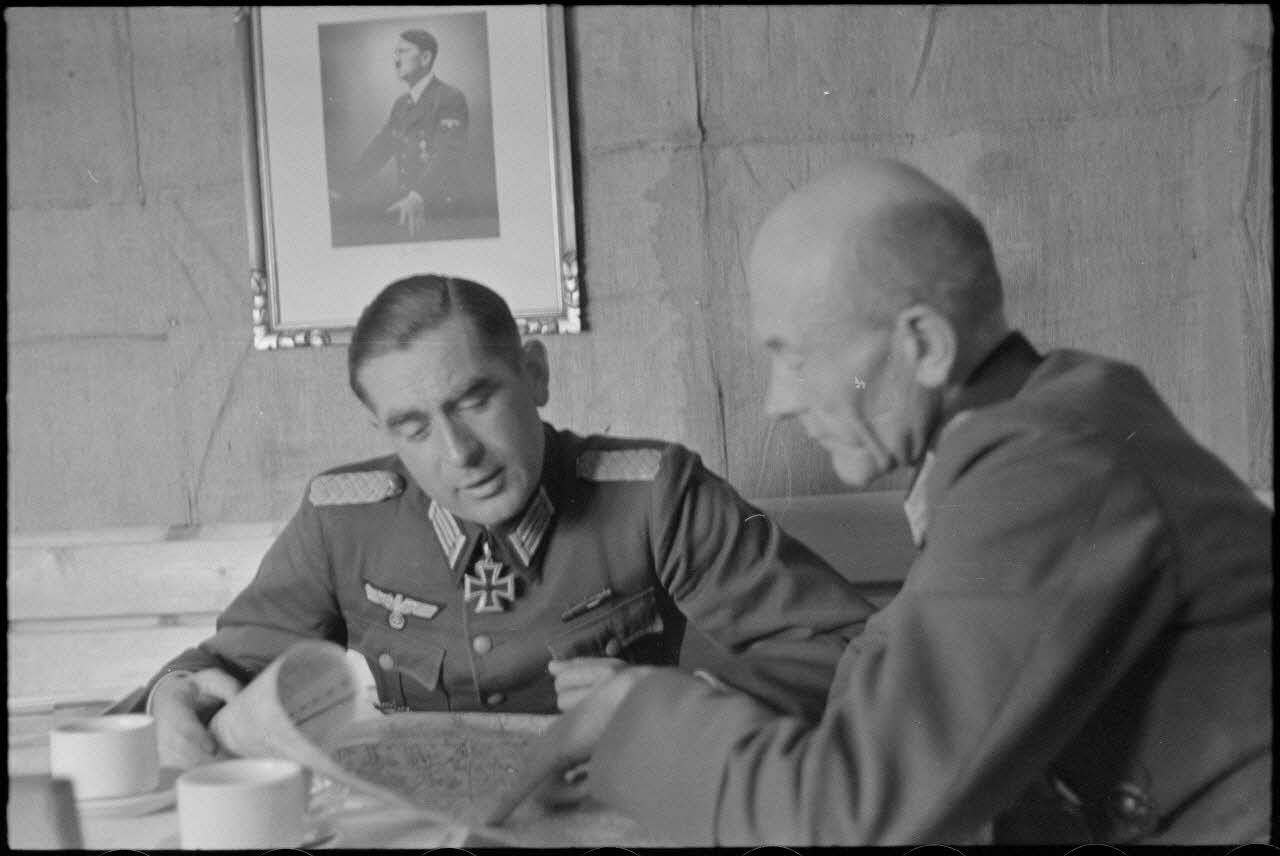 Dans un abri de campagne de la 205. Infanterie-Division, le commandant (Major) Hans Müller travaille en compagnie d'un autre officier.