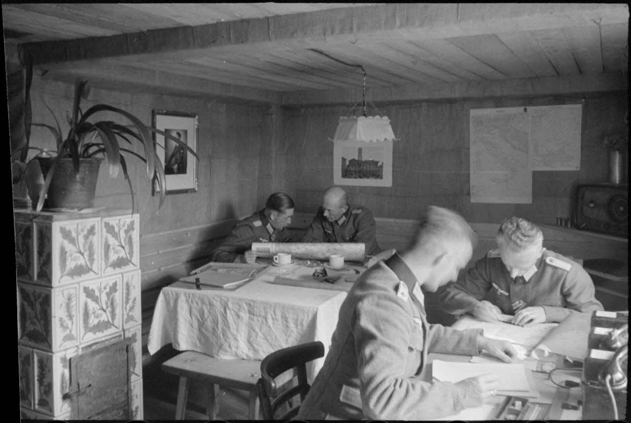 Dans un abri de campagne de la 205. Infanterie-Division, le commandant (Major) Hans Müller travaille en compagnie d'un autre officier.