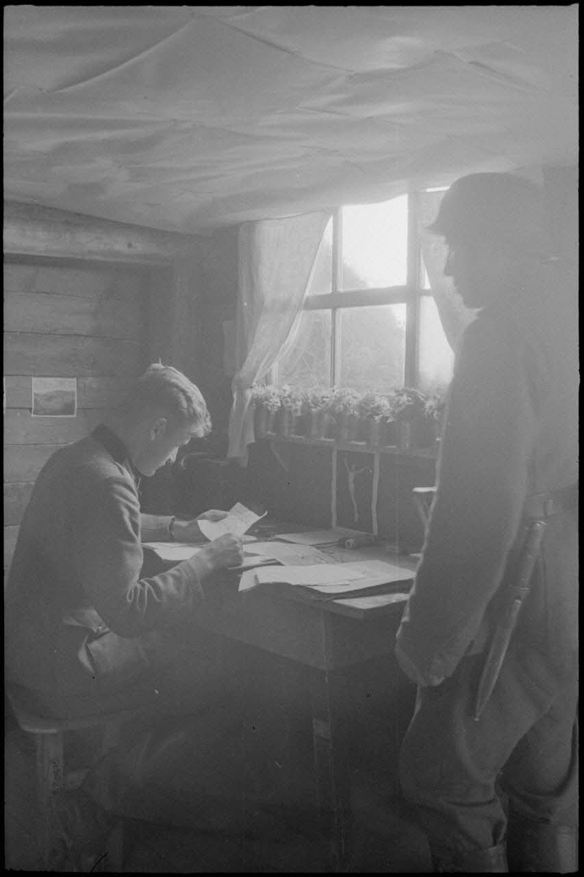 Assis dans un abri de la 205. Infanterie-Division, un transmetteur rédige du courrier, au-dessus de sa tête la devise "Mut und Tapferkeit" (courage et bravoure).