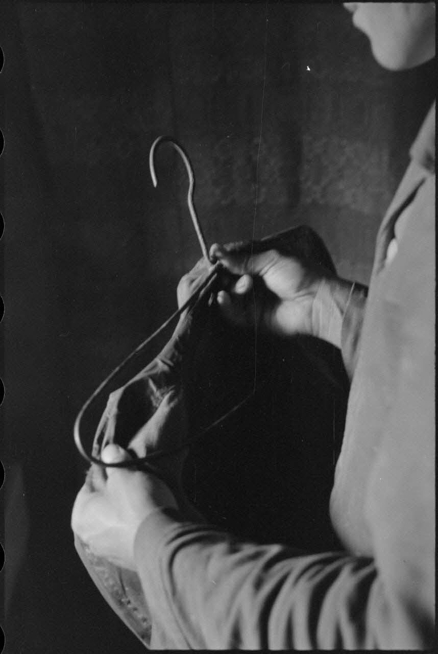Dans un abri de campagne, la vie quotidienne de fantassins de la 205. Infanterie-Division (rangement d'un uniforme).