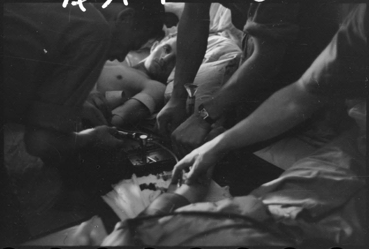 Dans un hôpital de campagne, un médecin militaire (capitaine ou Hauptmann) procède à une transfusion sanguine entre un blessé et de ces camarades. Grâce à un container sanitaire, l'officier dispose du matériel adéquat.