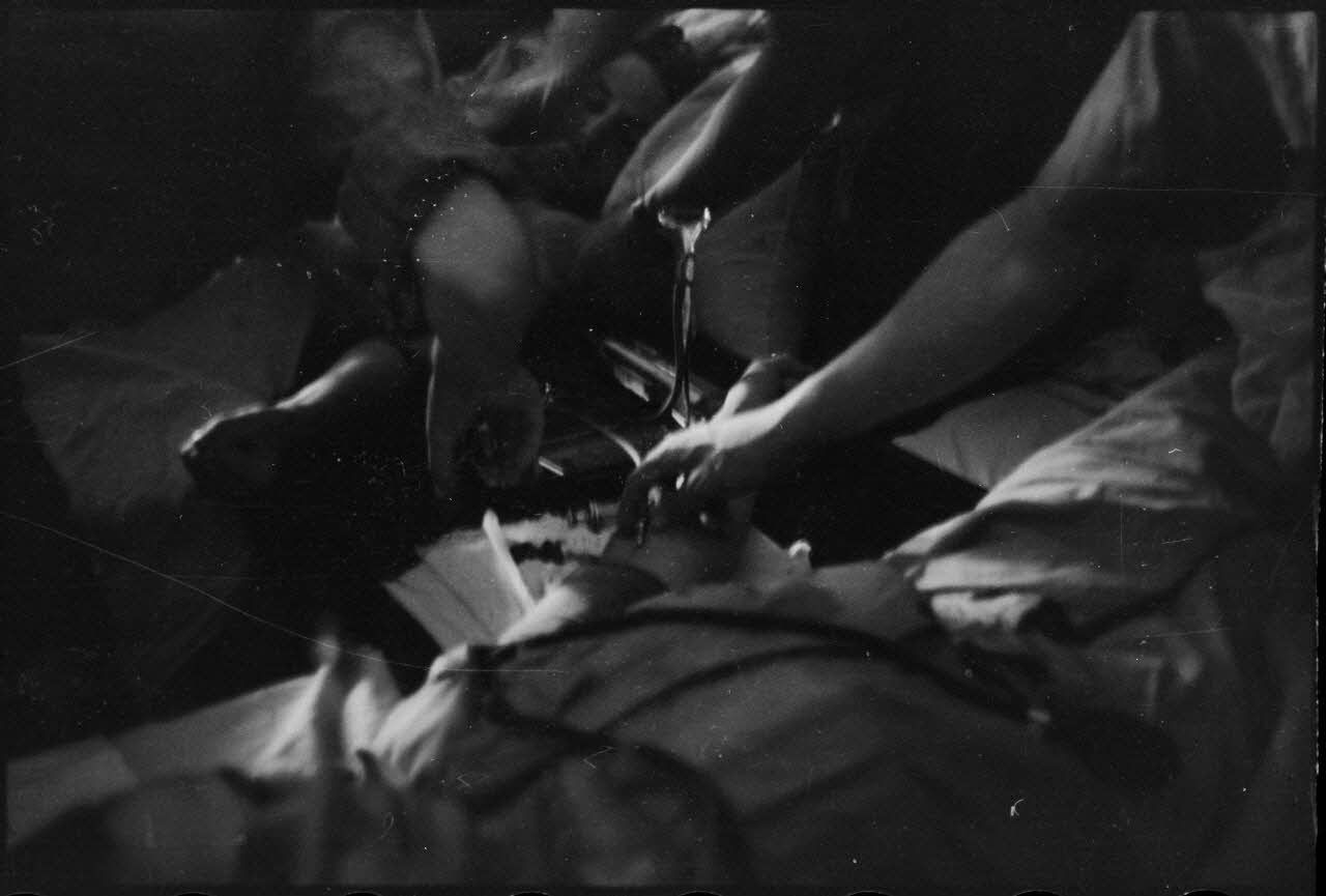 Dans un hôpital de campagne, un médecin militaire (capitaine ou Hauptmann) procède à une transfusion sanguine entre un blessé et de ces camarades. Grâce à un container sanitaire, l'officier dispose du matériel adéquat.