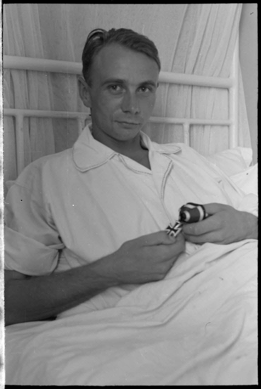 Dans un hôpital militaire, portrait de Josef Wenigmann du Sturzkampfgeschwader 3 (I-StG-3) récipiendaire de la croix de chevalier de la croix de fer (Ritterkreuz).