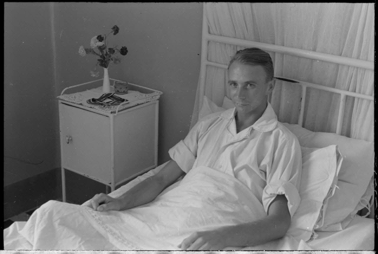 Dans un hôpital militaire, portrait de Josef Wenigmann du Sturzkampfgeschwader 3 (I-StG-3) récipiendaire de la croix de chevalier de la croix de fer (Ritterkreuz).