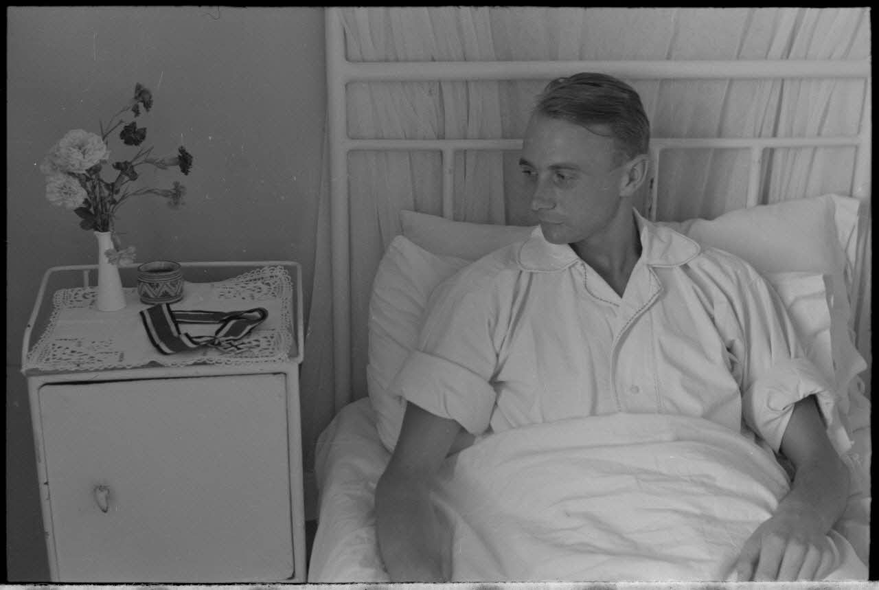 Dans un hôpital militaire, portrait de Josef Wenigmann du Sturzkampfgeschwader 3 (I-StG-3) récipiendaire de la croix de chevalier de la croix de fer (Ritterkreuz).