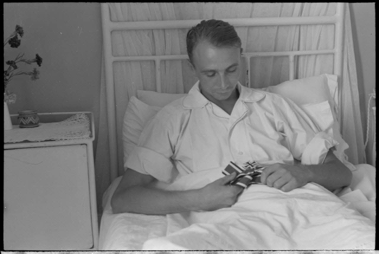 Dans un hôpital militaire, portrait de Josef Wenigmann du Sturzkampfgeschwader 3 (I-StG-3) récipiendaire de la croix de chevalier de la croix de fer (Ritterkreuz).