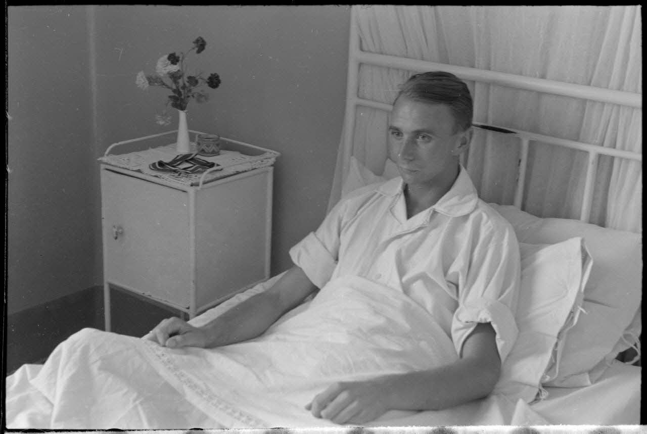 Dans un hôpital militaire, portrait de Josef Wenigmann du Sturzkampfgeschwader 3 (I-StG-3) récipiendaire de la croix de chevalier de la croix de fer (Ritterkreuz).