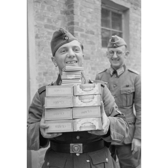 Un caporal de l'armée de terre (Gefreiter) reçoit des cigares et cigarettes de l'officier responsable du magasin d'approvisionnement.