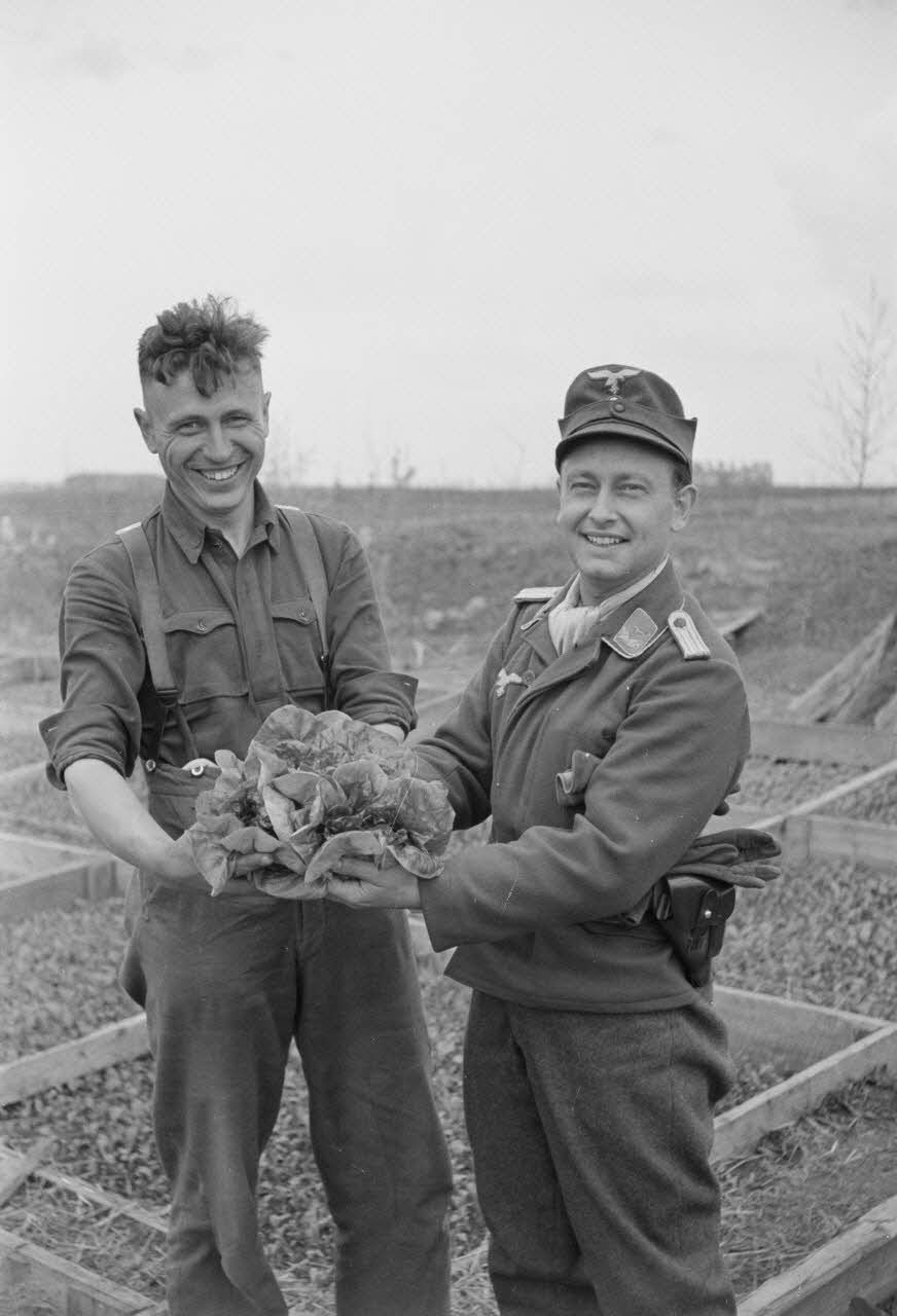 Dans une ferme réquisitionnée par la Luftwaffe, deux aviateurs présentent une salade, à droite le sous-lieutenant est un membre de la 1re compagnie de propagande de l'armée de l'air allemande.