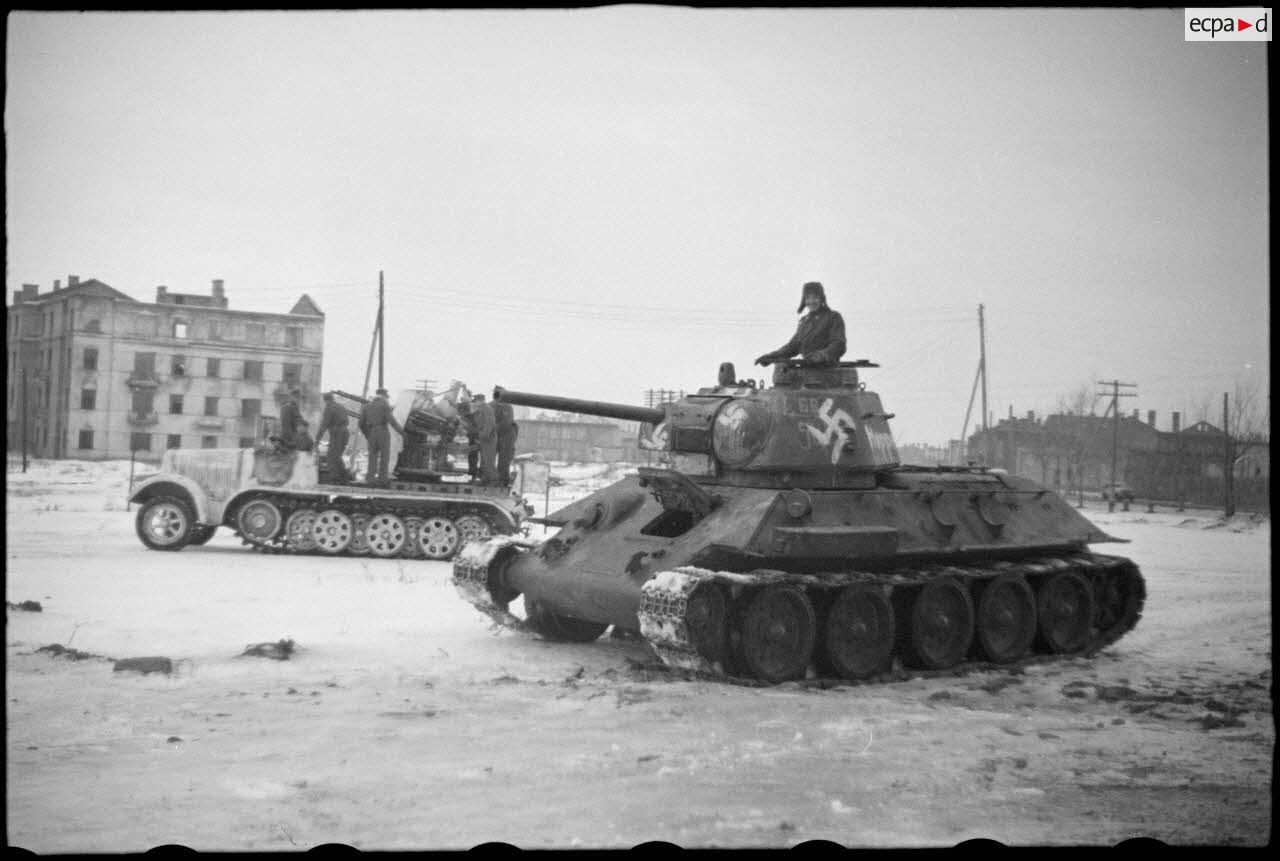 Dans une rue de Witebsk, un char soviétique T-34 (Beutepanzer) capturé. On remarque le nom du commandant "Hoppe" peint sur la tourelle du char.
