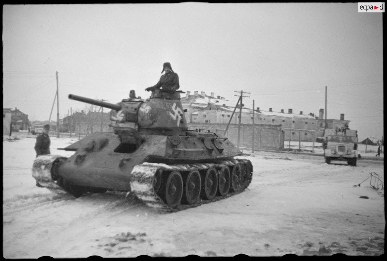 Dans une rue de Witebsk, un char soviétique T-34 (Beutepanzer) capturé. On remarque le nom du commandant "Hoppe" peint sur la tourelle du char.