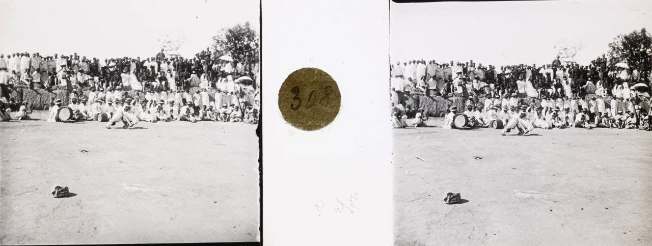 D68-29. Le terme malgache "kabary" désigne à l'origine un discours prononcé par le roi lors d'une assemblée consacrée à la discussion des affaires publiques et, par extension, toute fête traditionnelle publique. René Denis photographie le kabary qui a lieu, après la prise d'armes du 14 juillet 1908, sur l'île du lac Anosy. Une autre de ces réunions se tient à Manjakandriana, à 30 km à l'est de la capitale, où se produisent les musiciens de l'orchestre local, des chanteurs, des conteurs.
