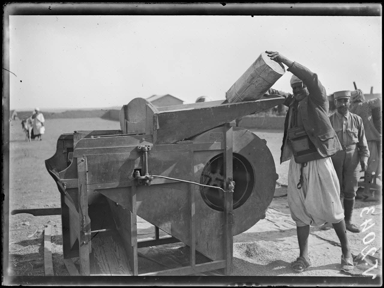Dar-Bel-Hamri. Battage mécanique du blé. [légende d'origine]