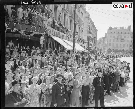 Voir la noticeLa population marseillaise acclame les troupes lors du défilé, à l'angle de la Canebière et du quai des Belges.