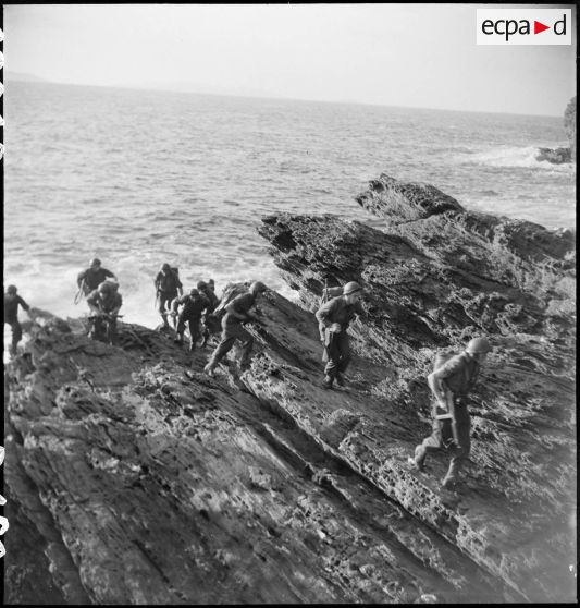 Des membres du groupe des commandos d'Afrique, devenu 5e bataillon de choc, montent à l'assaut de la batterie d'artillerie côtière allemande du Cap Nègre.