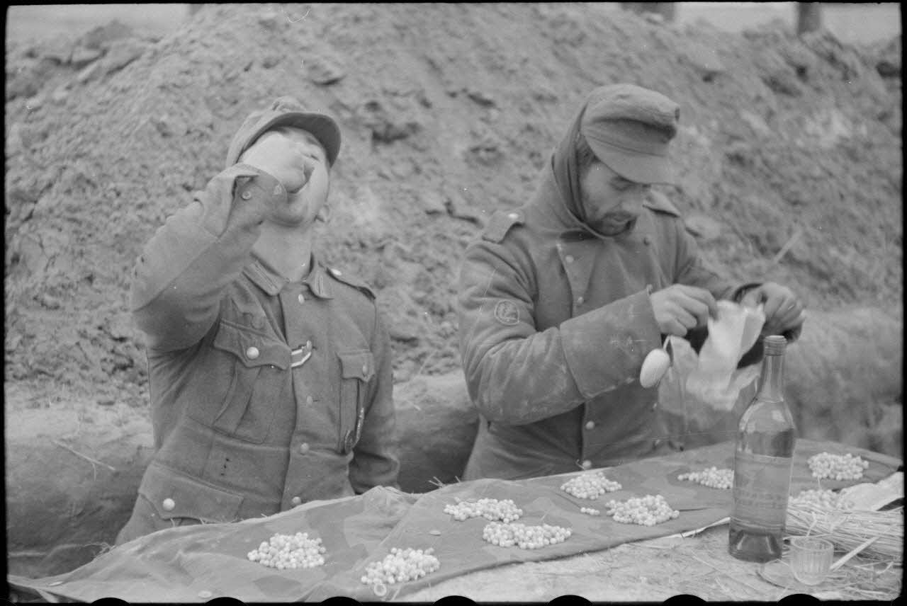 Debouts dans une tranchée, deux chasseurs (Jäger) ingurgitent des denrées (baies) reçues en cadeau.
