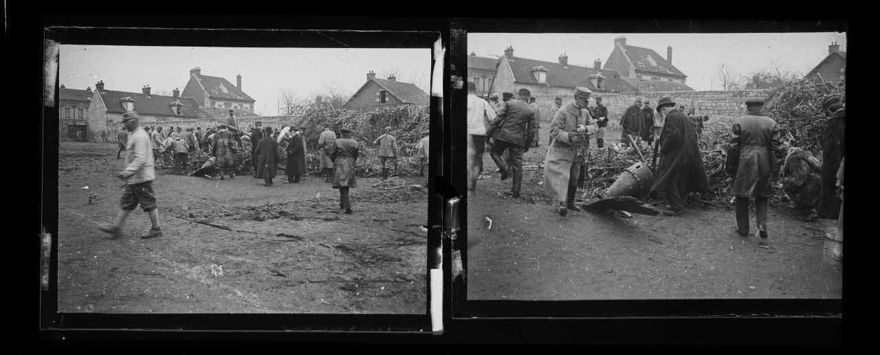 Archives photographiques de Jules-Louis Breton (1872-1940). Plaques [Hôtel de ville de Roye (Somme), église de Ribécourt (Oise), débris d'un zeppelin à Compiègne en 1917, voyage en Angleterre en 1917].