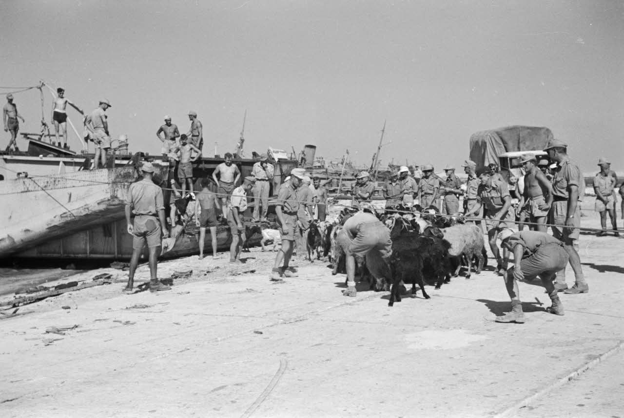 Dans le port de Marsa Matruh, des marins allemands de la Kriegsmarine débarquent un chargement de mouton et des chèvres. Les bêtes sont dirigées vers des enclos. La légende d'origine précise qu'il y également du poisson frais en plus de la viande, pour le grand plaisir des soldats.