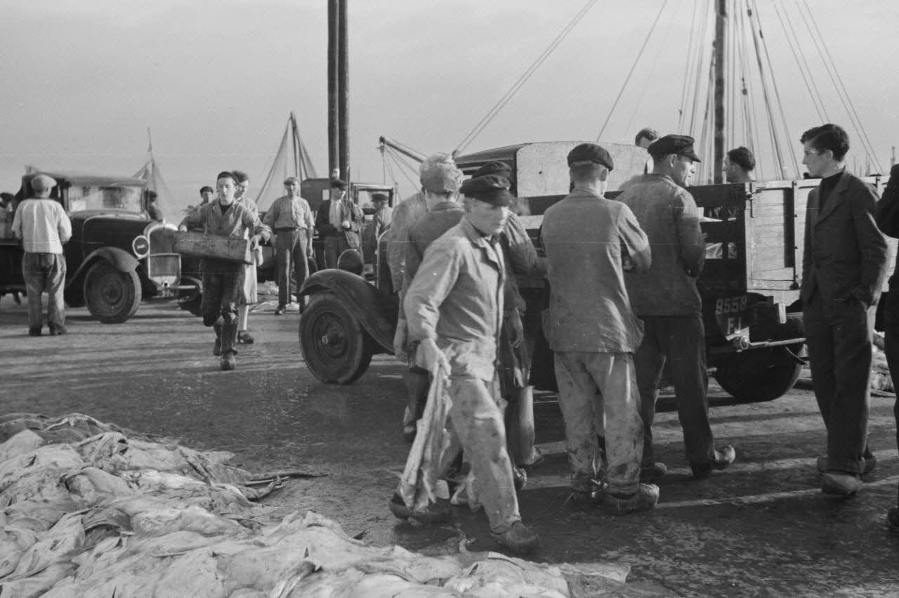 Des hommes âgés devant la pêche qui vient d'être déchargée dans le port de Douarnenez.