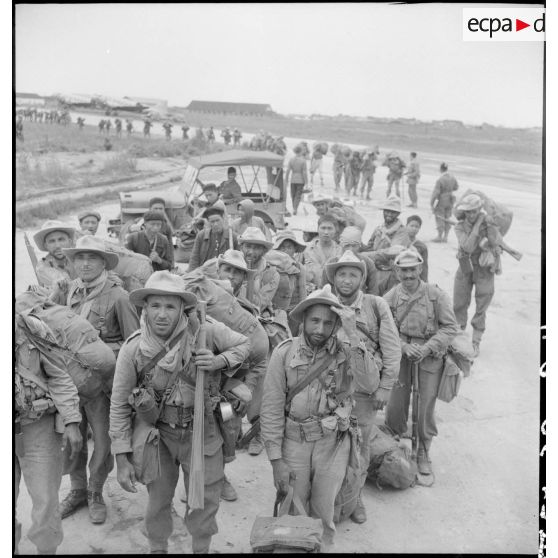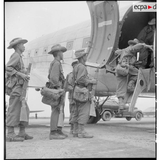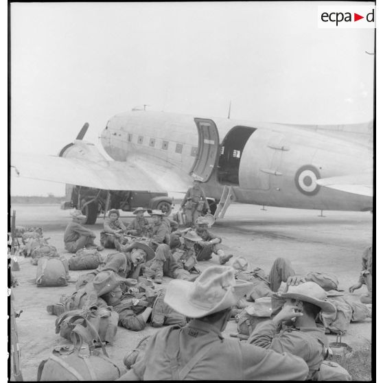 Des éléments de la compagnie indochinoise de parachutistes du 8e bataillon de parachutistes coloniaux (8e BPC) attendent d'embarquer sur l'aérodrome de Gia Lam.