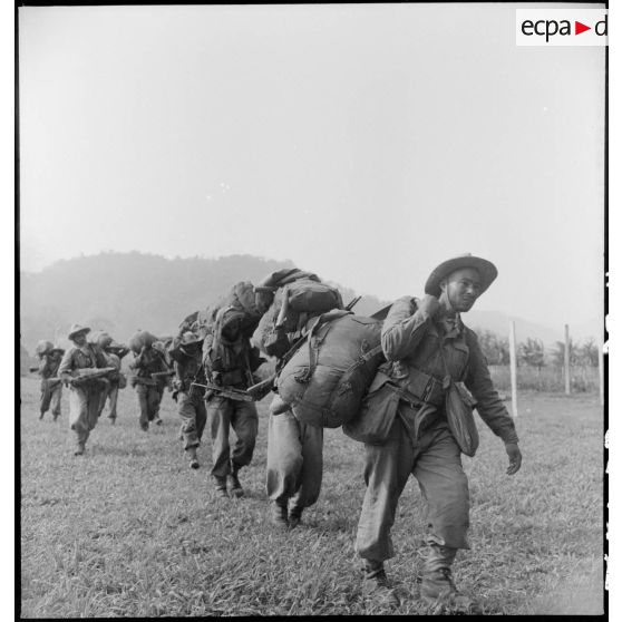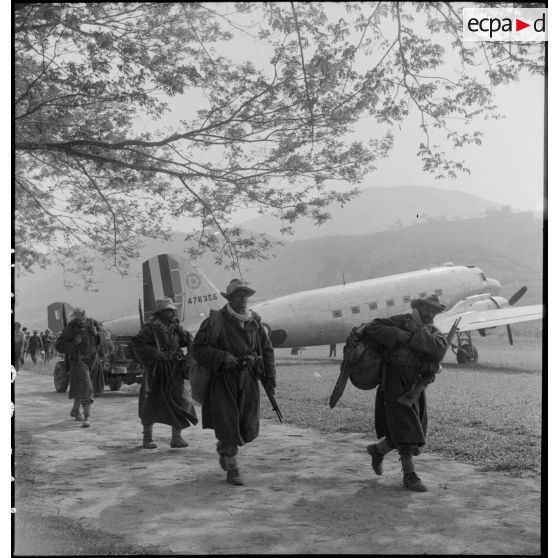 Venant de débarquer à Laï Chau d'un avion Douglas C-47B Skytrain, des goumiers du 17e tabor marocain progressent avec leur paquetage en direction de la rivière Nam Na pour y installer un campement.
