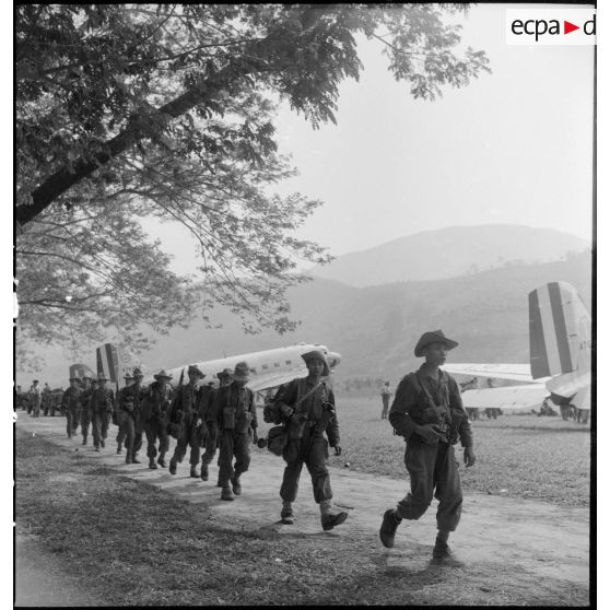 Colonne de soldats de la compagnie indochinoise de parachutistes du 8e bataillon de parachutistes coloniaux (8e BPC) sur le terrain d'aviation de Laï Chau.