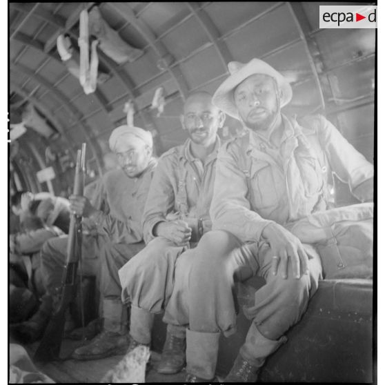Des goumiers du 17e tabor marocain à l'intérieur d'un avion les menant à Laï Chau.