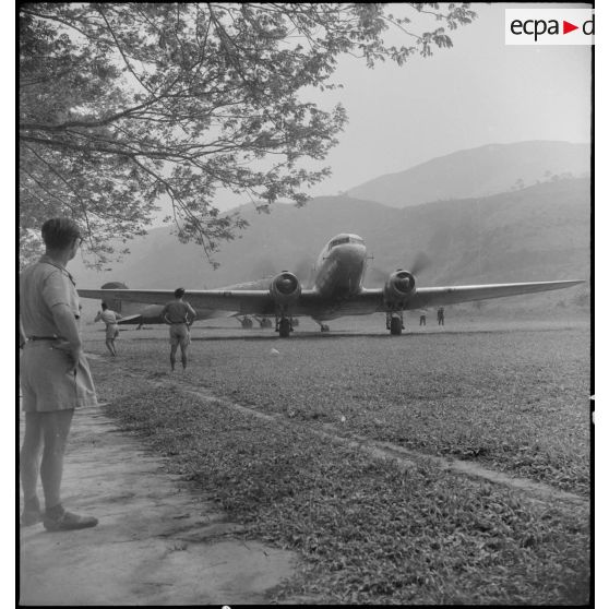Un avion de transport Douglas C-47 Skytrain au point fixe sur le terrain de LaÏ Chau.
