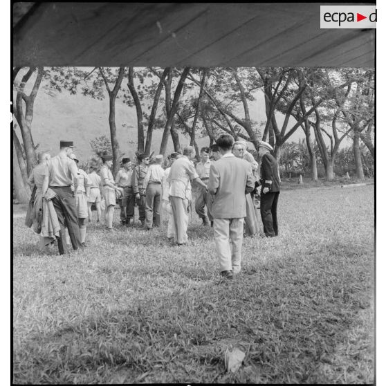Des officiers sont rassemblés sur le terrain d'aviation de Laï Chau lors du départ du général Salan.