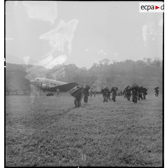 Embarquement de la compagnie indochinoise de parachutistes du 8e bataillon de parachutistes coloniaux (8e BPC) à bord d'un Douglas C-47B à Gia Lam à destination de Hanoï.