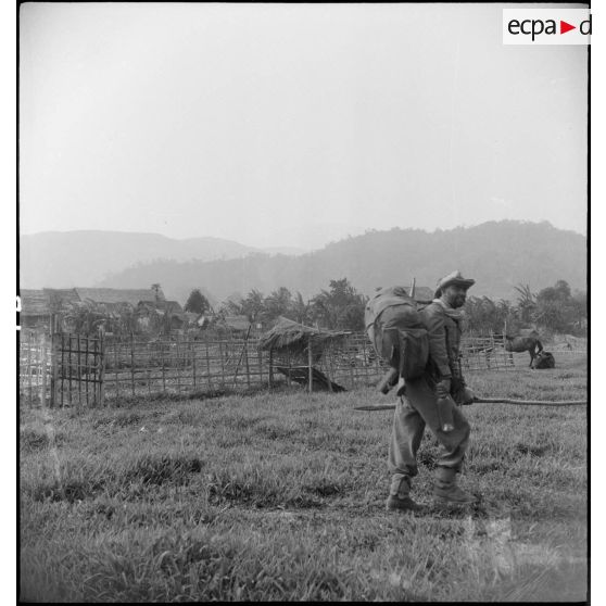 Venant de débarquer à Laï Chau, des goumiers du 17e tabor marocain progressent avec leur paquetage en direction de la rivière Nam Na pour y installer un campement.