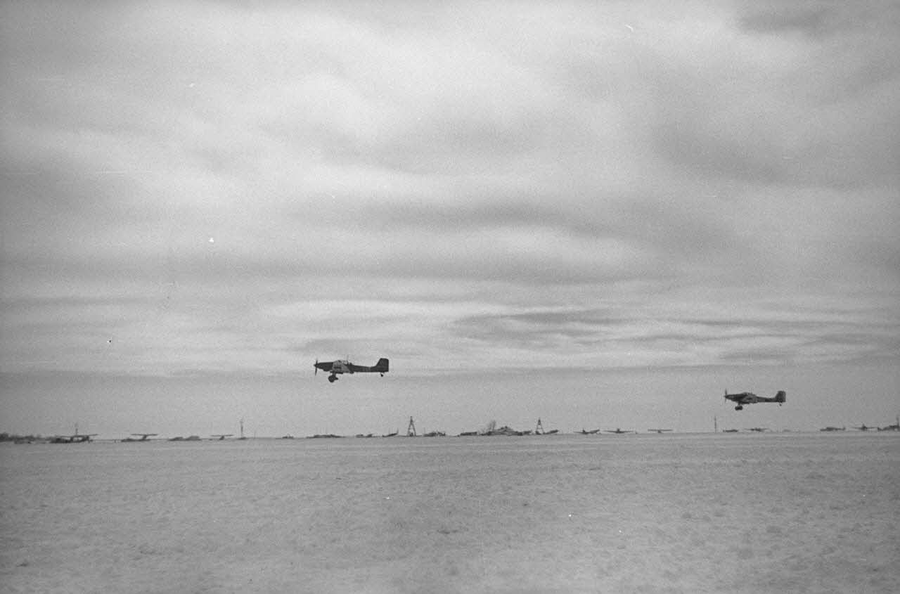 Ces Junkers Ju-87 « Stuka » D8 du I./StG2 «Immelmann » (Sturzkampf-Geschwader 2) sont soutenus par des Henschel 129 Hs-129 et escorté par des Messerschmitt Me-109 E et des Messerschmitt Me-110. La piste est recouverte de neige et le froid ajouté au vent rendent la vie des pilotes et des personnels au sol de la Luftwaffe très difficile.