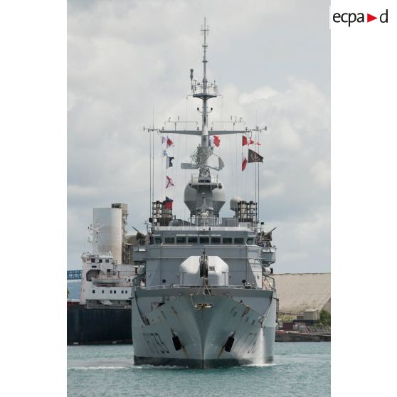 La frégate de surveillance Ventôse manoeuvre pour se mettre à quai dans la base navale de Fort-de-France, en Martinique.