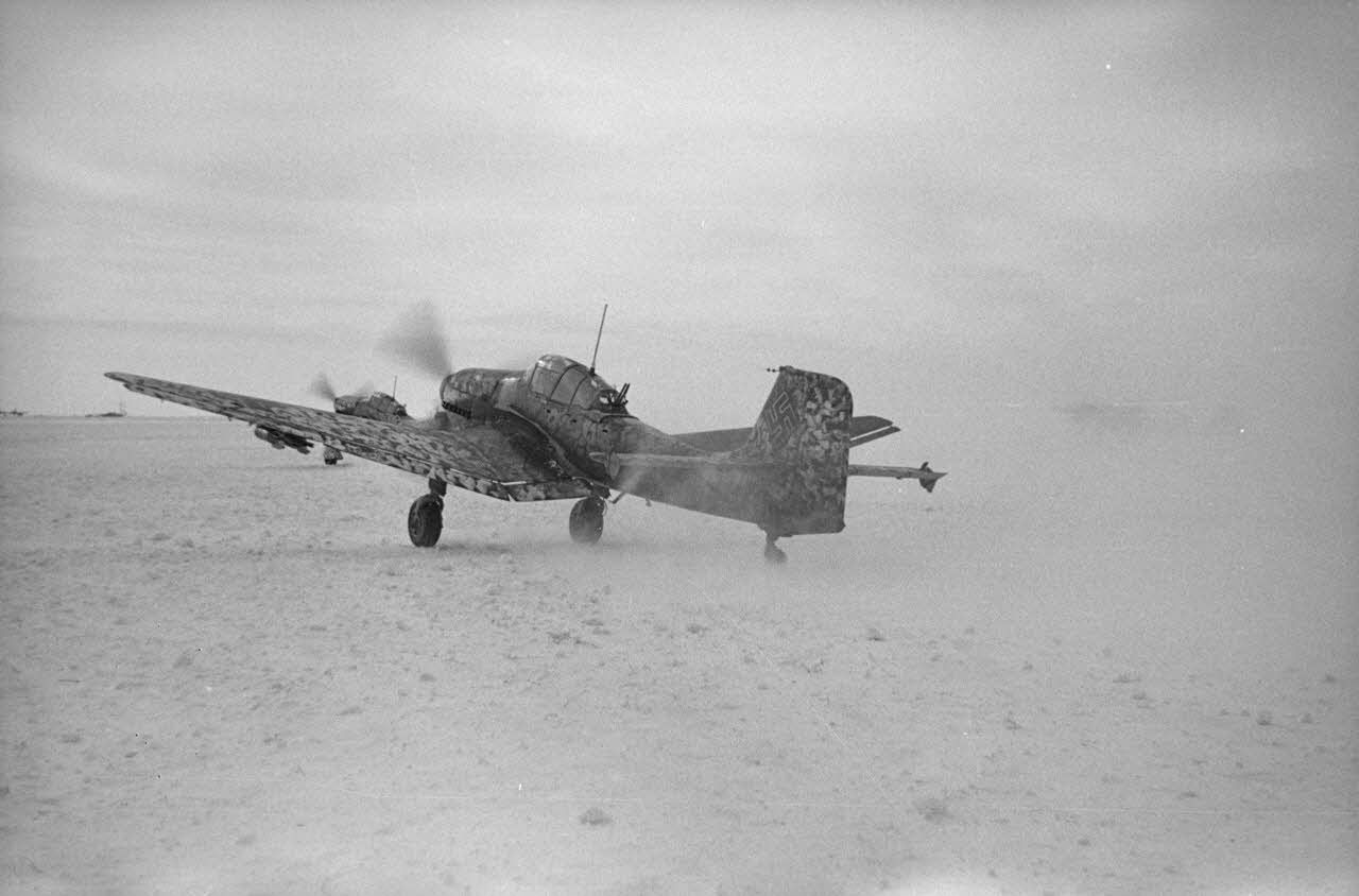 Un bombardier Junkers Ju-87 Stuka du Sturzkampfgeschwader 2 "Immelmann" sur le point de décoller sur un terrain d'aviation enneigé.